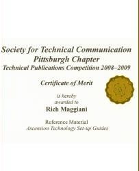 Solari Communication received a Merit award for the writing, photography, and design of a trio of Set-up Guides for Ascension Technology. Based in Milton Vermont, Ascension Technology makes three-dimensional tracking devices for medical guidance, minimally invasive surgery, real-time visualization, and target acquisition. The Pittsburgh Chapter of the Society for Technical Communication awarded Solari with this honor through its regional communication competition.