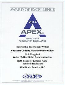 Communications Concepts announced today that Solari Communication has won its Apex Award of Excellence for the Coating Machine User Guide that Rich wrote for Sung An Machinery (SAM) of Korea for one of its international clients. The company’s subsidiary, SAM North America, originally hired Rich and Solari Communication to improve the quality of their user guides, and this award demonstrates our commitment to helping them achieve their goals.