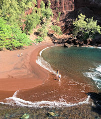 Along the way, they strolled along secluded black sand beaches, bushwhacked their way to remote waterfalls, and just generally stopped a lot. In Hana, they swam at the “secret” red sand beach (pictured here), paid their respects at Charles Lindberg’s grave site, swam in the Seven Sacred Pools, then drove the south side of Maui back to their starting point in Kahului. And, of course, stopped to admire the eight Auwahi wind turbines sited along Maui’s southern volcanic shores.